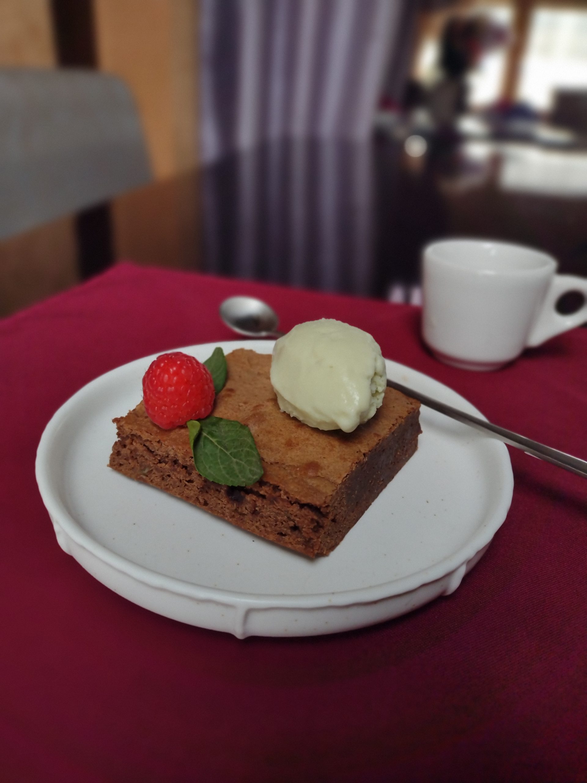 9.- Una vez frio desmoldar. Cortar en cuadrados, espolvorear azúcar glas y acompañar con helado.