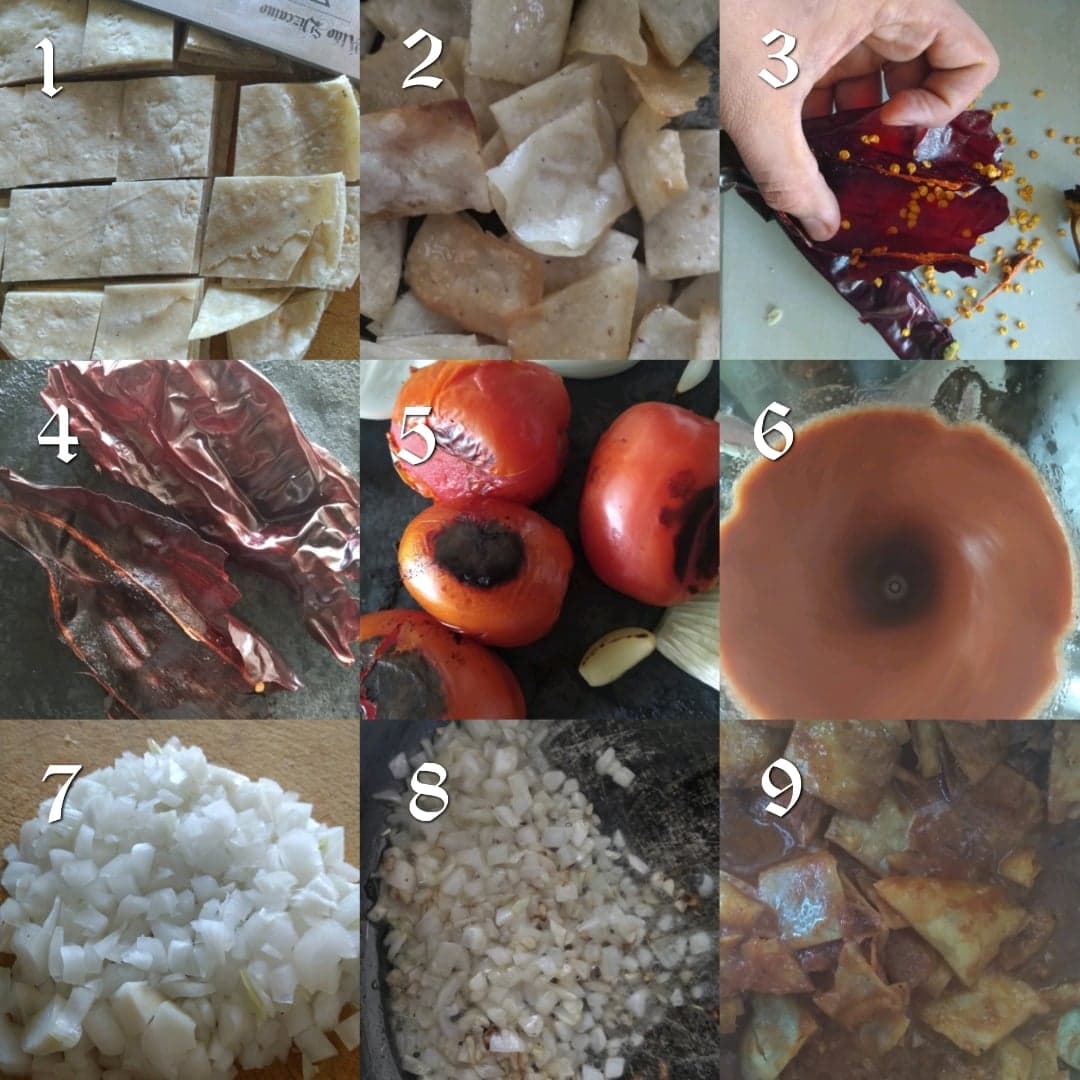 1.- Corta en cuadros medianos las tortillas y reserva. Calienta el aceite en una olla no muy grande para que pueda quedar con profundidad.